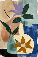 Het palet is divers en gedurfd, met gebruik van zowel aardse tonen als levendige kleuren, waaronder terracotta, olijfgroen, hemelsblauw, en een opvallend paars. De organische vormen van bladeren en bloemen contrasteren met de geometrische achtergrond, wat zorgt voor een intrigerend spel tussen natuur en abstractie. Het lijkt alsof de kunstenaar de essentie van planten heeft willen vangen door ze te reduceren tot simpele vormen, die samen een gevoel van rust en esthetische voldoening overbrengen. De compositie is zowel evenwichtig als dynamisch, met een duidelijke inspiratie van de cut-out techniek van Matisse.
