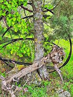 Ik kwam dit bijna lyrische tafereel tegen van een levende boom die een dode boom ondersteunt die in een hoek is gevallen met daarachter een grote hoeveelheid zwarte waterleiding. Het deed me denken aan ballet, een symbolische pas de deux, waarbij de hoge levende boom misschien de mannelijke partner is en de omgevallen boom de…