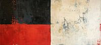 Contrast | Echoes of Silence - Dit abstract schilderij toont een krachtige juxtapositie van donker en licht met een dominante, levendige rode strook aan de onderkant, geflankeerd door diepzwarte en subtiele beige vlakken, wat een visueel intrigerend contrast vormt.