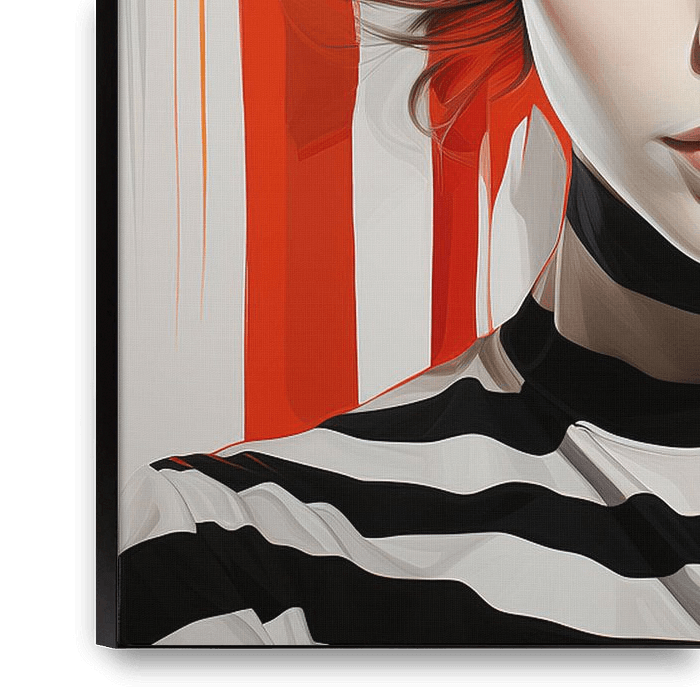 De strepen op haar kleding lijken te dansen in harmonie met de rood getinte achtergrond, waardoor een gevoel van energie en dynamiek ontstaat. De vrouw, met een blik van vastberadenheid, lijkt verbonden met de pulserende kracht van de rode strepen om haar heen.