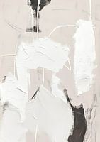 abstracte compositie die wordt gekenmerkt door subtiele contrasten en een ingetogen kleurenpalet. De primaire tinten bestaan uit wit, beige en zwart, die op harmonieuze wijze met elkaar verweven zijn. Het werk maakt gebruik van losse, ruwe penseelstreken en onregelmatige vormen, waardoor een dynamische en organische uitstraling ontstaat. De witte vlakken lijken op doeken of lagen die gedeeltelijk zijn afgescheurd, terwijl de zwarte accenten diepte en dramatiek toevoegen aan de verder rustige compositie.