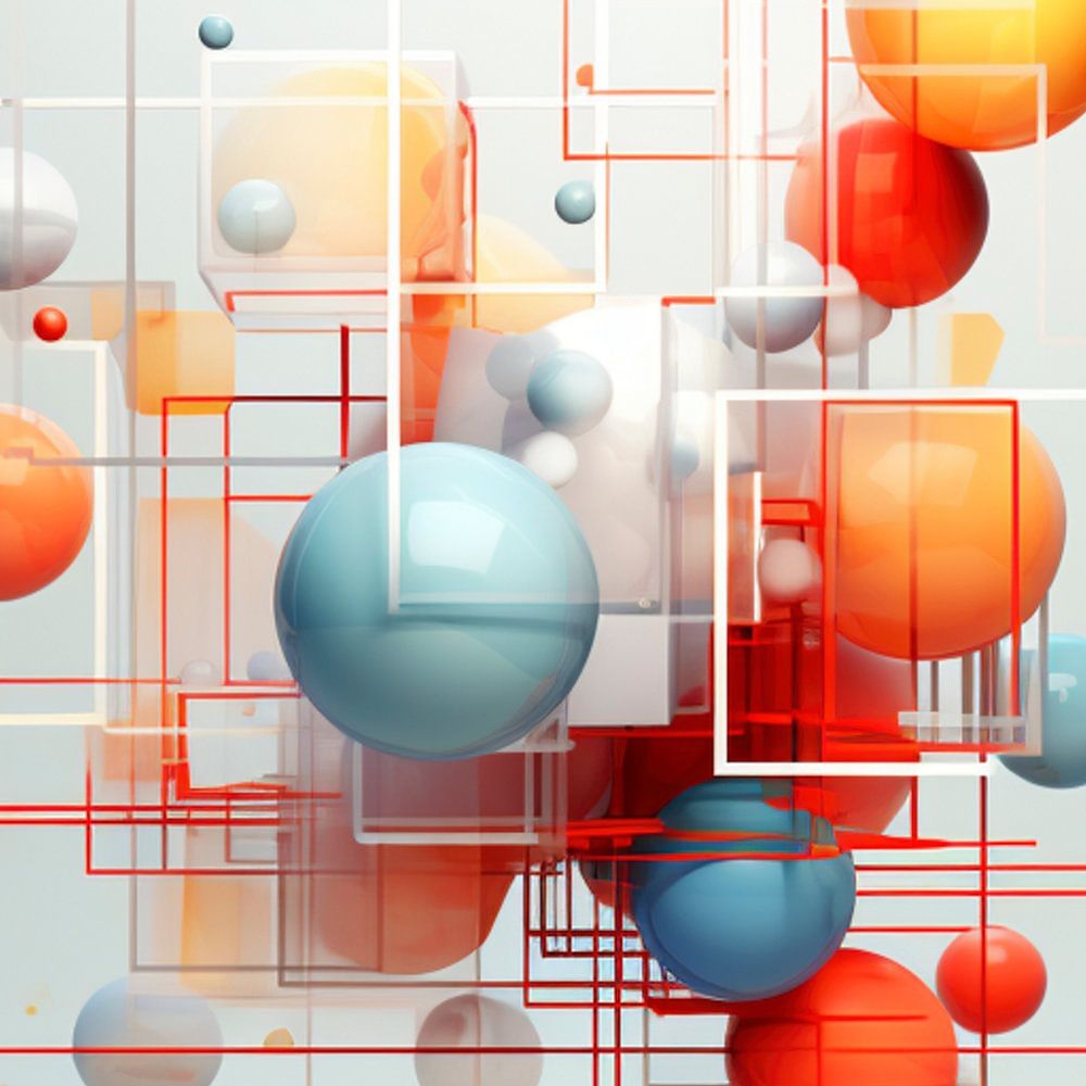 Het kunstwerk bestaat uit verschillende elementen die met elkaar verbonden zijn door rode lijnen die geometrische figuren vormen. De belangrijkste elementen zijn de gekleurde bollen, die verschillende groottes hebben en verspreid zijn over de afbeelding. Ze hebben een gladde textuur en komen in tinten van blauw, oranje en wit. Sommige bollen zijn omhuld door transparante kubussen, die een extra laag van complexiteit toevoegen aan de compositie.