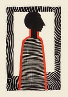 Dit moderne, abstracte kunstwerk toont een gestileerde menselijke figuur met hoekige trekken, geaccentueerd door gedurfde rode contouren en geplaatst tegen een dynamische achtergrond van zwarte en witte golvende lijnen. De contrasterende elementen creëren een gevoel van beweging en complexiteit, waardoor het een visueel opvallend stuk is.