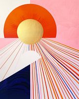 Het stuk is opgebouwd uit verschillende segmenten met contrasterende texturen en kleurschema's die samen een harmonieus geheel vormen. In het midden van de compositie is een goudgele cirkel die de zon voorstelt, omgeven door een fel oranje halo. Deze centrale figuur straalt letterlijk uit naar de rest van het canvas in een reeks stralen die variëren in kleur van wit tot diep oranje en roze, waardoor een gevoel van warmte en uitstraling wordt gecreëerd. Het onderste deel van het schilderij bevat een donkerblauw segment dat golven of een nachtelijke hemel zou kunnen voorstellen, wat een interessant contrast biedt met de rest van de warme kleuren. De achtergrond is verdeeld in verschillende tinten roze, wat de algehele zachtheid en kalme uitstraling van het werk versterkt.