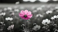 De foto toont een macro-opname van een schijnbaar eindeloos, monochroom bloemenveld waarin een enkele, intens gekleurde bloesem op de voorgrond alles overtreft. De omringende bloemen en stengels zijn zachtjes gedesatureerd, hun vormen versmolten tot een rustige textuur, waardoor de sterke kleur van de hoofdbloem des te beter uitkomt.…