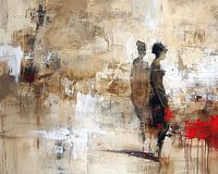 Contrast - Dit schilderij spreekt tot de verbeelding met zijn abstracte vormgeving en een subtiele suggestie van figuren omringd door aardse tinten, afgewisseld met dynamische penseelstreken. De rode accenten voegen energie toe aan de rustgevende beige en bruine palet, terwijl texturen en lagen diepte geven aan het canvas.