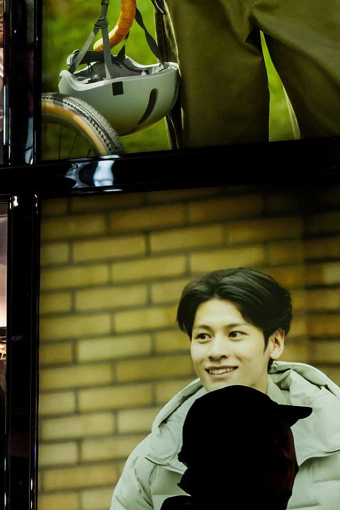 Een contour van een man die voor een lichtreclamepaneel langs loopt in het centrum van Tokyo in Japan.