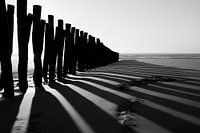 Tegenlichtopname van de ondergaande zon aan de opaalkust in noord Frankrijk. De golfbrekers werpen hun schaduw over het strand bij eb.