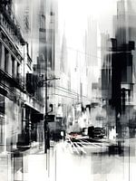 "Contrasten van de Stadsziel" is een krachtig kunstwerk dat de essentie van het stadsleven vastlegt in vloeiende, abstracte vormen. De levendige energie van de stad wordt weerspiegeld in de scherpe contrasten en het spel van licht en donker, wat een beeld oproept van een wereld die constant in beweging is.