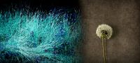 Een 2-ledig beeld. Links woelig gras uitgevoerd in turquoise en rechts een pluizenbol van een uitgebloeide paardenbloem. De ene kant onrustig in een felle kleur, de andere kant sereniteit in rustige kleurtonen.