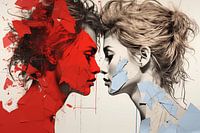 Dit schilderij verkent de complexiteit van identiteit en toont een visueel samenspel van contrasterende elementen. Door een samensmelting van kleuren en vormen legt het de interactie vast tussen het innerlijke zelf en de externe perceptie, wat uitnodigt tot contemplatie over de complexiteiten en nuances die individuele identiteit definiëren.