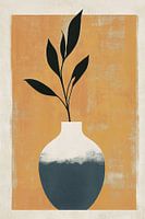 Een stijlvolle minimalistische compositie waarin een tweekleurige vaas, uitgevoerd in diep petrolblauw en roomwit, centraal staat tegen een warme terracotta achtergrond. De elegante zwarte bladeren die uit de vaas rijzen creëren een krachtig silhouet dat het moderne en organische karakter van het werk benadrukt.