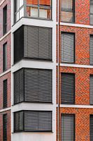 Dit digitale kunstwerk toont de gevel van een modern gebouw dat wordt gekenmerkt door het contrast tussen twee bouwstijlen. De linkerkant wordt gedomineerd door grote ramen met horizontale lamellen, die een open, transparant effect creëren. De rechterkant daarentegen toont een meer traditionele bakstenen gevel met kleinere ramen - een opzettelijke breuk die de complexiteit van stedelijke architectuur thematiseert.