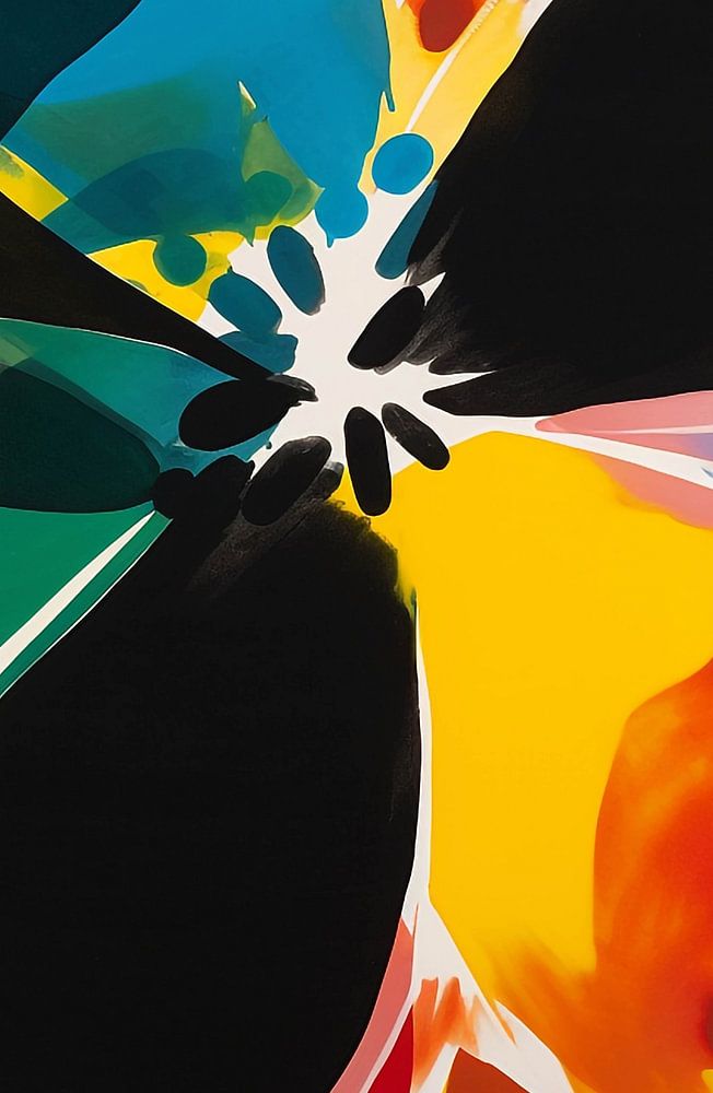 Dit indrukwekkende, veelkleurige schilderij op een zwarte achtergrond is een eerbetoon aan de Flower Power-beweging. In de stijl van donker wit en donker cyaan, met gladde penseelstreken, brengt het kunstwerk een vurige energie tot leven met gedurfde primaire kleuren.