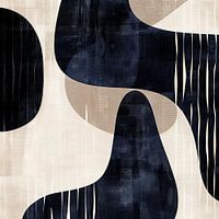 Dit werk is een toonbeeld van minimalistische elegantie, waar donkere, bijna zwarte vormen in harmonie samenvloeien met zachte, beige vlakken. De abstracte compositie van gebogen en rechte lijnen speelt met de perceptie van diepte en beweging, en creëert een intrigerend visueel ritme. Het stuk zou een verfijnde toevoeging zijn aan een modern interieur, met name in ruimtes die baat hebben bij kunst die subtiliteit en kracht combineert