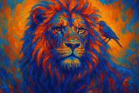 Een majestueuze leeuw met vogel staat centraal in een krachtig kleurcontrast van warme oranje tonen en koele blauwaccenten. De expressieve penseelstreken geven beweging aan de manen, terwijl de serene blik rust brengt in het geheel. Subtiele schaduwen verdiepen het gezicht en laten details in snorharen en vacht oplichten. De compositie…