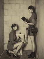 Deze foto toont twee vrouwen in een kale, smalle kamer met betonnen muren, die een beklemmende maar dramatische sfeer creëren. De ene vrouw zit geknield naast een toilet en is vastgebonden met kettingen die ze met afgewende ogen in haar handen houdt. De andere vrouw staat voor haar met een groot boek in haar hand en lijkt haar aandacht er volledig op te richten, terwijl de ketting losjes aan haar hand hangt.
