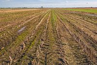 Schilderachtig landschap met convergerende rijen van maisstoppels op een grote akker. Het is een zonnige maar ook bewolkte dag in het winter seizoen. De foto is gemaakt bij het Brabantse dorp Terheijden, gemeente Drimmelen, niet ver van de oever van de Mark rivier.