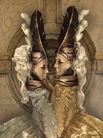 Gekostumeerde vrouwen met masker in conversatie tijdens het bal.