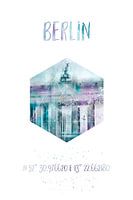 De Brandenburger Tor in Berlijn ligt aan de Pariser Platz in de wijk Mitte en is een bekend symbool van de Duitse hoofdstad. De Brandenburger Tor en de Pariser Platz vormen het einde van de Unter den Lindenstraat. Op de achtergrond staat de televisietoren. Moderne kleuraccenten en grafische nuances vinden een unieke combinatie. Heldere aquarellen onderstrepen de stedelijke dynamiek. Extravagante indruk in geometrische vorm met aanduiding van de coördinaten.