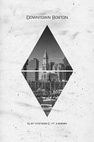 Een boottocht voor de kust van Boston. Een idyllisch monochroom uitzicht op de skyline van North End met de Custom House Tower en de moderne wolkenkrabbers van het financiële district in een geometrische vorm die de coördinaten aangeeft - eenvoudig vintage design.