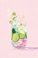 Een kleurrijke illustratie van een verfrissend drankje met komkommerschijfjes en ijsblokjes, gedecoreerd met delicate groene blaadjes tegen een zachte roze achtergrond. De waterige texturen en transparante effecten creëren een elegante, moderne uitstraling die perfect de zomerse frisheid vangt.