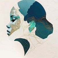 Gracieus lijnportret van een vrouw en profil. Mysterieuze, abstract golvende lijnen en circles, onderbroken door een sereen kleurenpalet van zachte, complementaire pasteltinten. Groenblauwe elementen, lucht en water, aardetinten en goud. Relaxed, mindful en kalm.