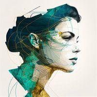 Gracieus lijnportret van een vrouw en profil. Mysterieuze, abstract golvende lijnen en circles, onderbroken door een sereen kleurenpalet van zachte, complementaire pasteltinten. Groenblauwe elementen, lucht en water, aardetinten en goud. Relaxed, mindful en kalm.