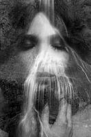 Double exposure van van twee foto's. Een portret van een vrouw en een natuurbeeld van een rotspartij met een waterval zijn samengevoegd. De samengevoegde foto's geven een dromerig effect waar je je fantasie bij kunt laten werken. Surrealistisch. Zwartwit fotografie.