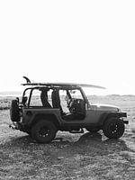 Surfauto met surfplank in Californië. Zwart-wit foto van de zomer. Surfer strand fotografie.