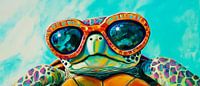 Een vrolijke leeftijdgenoot die met zijn stijlvolle zonnebril de wereld inkijkt, straalt ontspannen sereniteit uit. De heldere kleuren en het charmante oog voor detail zorgen voor een positieve stemming. Dit kunstwerk is een perfecte toevoeging aan een woonkamer, waar het gesprekken kan stimuleren en goed humeur kan verspreiden.
