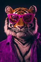 Een woeste tijger met een roze zonnebril en een stijlvol paars shirt straalt ongedwongen charme uit. Deze onconventionele afbeelding brengt een vleugje exotisme en speelsheid in de kamer. Perfect voor een woonkamer, waar het een gesprek kan stimuleren en de stemming kan verlichten. Een echte blikvanger voor gedurfde stylisten!