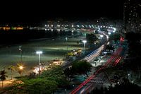 Het half maanvormige strand van Copacabana aan de Avenida Atlântica tijdens de avonduren. De weg is altijd druk, wat in de avond mooie lichtstrepen geeft van het verkeer. De avondopname is genomen hoog vanaf een hotel met fantastisch uitzicht over de boulevard richting het verlichte Copacabana fort en Ipanema.