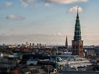 De daken van Kopenhagen, hoofdstad van Denemarken. Deze foto is gemaakt vanaf de Runde Tarn of Ronde Toren, een bezienswaardigheid in Kopenhagen. Door gebruik te maken vaan speciale lens is de scherpte op de foto heel selectief. Het geeft een een beeld alsof het een miniatuur of maquette betreft. Een mooi beeld van hoe in Kopenhagen, industrie en stad samengaan.