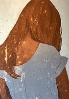 Details: vrouw, haar, roodbruin, blauw, textuur, portret, modern, kunst, schilderij, achterkant