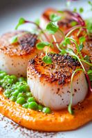 Een culinair meesterwerk dat de zintuigen prikkelt: perfect geschroeide sint-jakobsschelpen omringd door een fluweelzachte wortelcrème en verse doperwten. Een vleugje groene microgreens zorgt voor een levendig accent. Dit schilderij is ideaal voor de keuken of de eetkamer en brengt een vleugje elegantie en verwennerij in elke kamer.