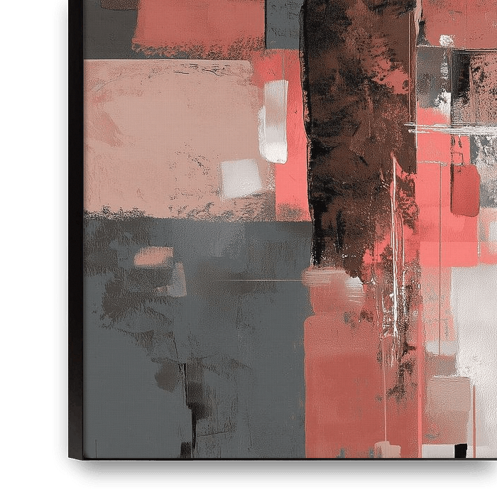 Coral Column - dit abstract schilderij toont een groot koraalrood vlak tegenover een stevige donkere verticale pilaar-achtige vorm, in een modern geometrisch, textuurrijk beeld met blokken en zachte overgangen in grijs, bruin en wit — ideaal als je zoekt op abstract schilderij of schilderij abstract of modern schilderij.