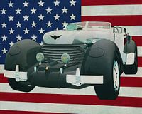 Dit schilderij van de Cord 812 Lone Runner Concept uit 1936 met de Amerikaanse vlag op de achtergrond is te koop in verschillende maten en kan zowel op doek als op hout en metaal worden afgedrukt. U kunt het schilderij ook laten afwerken met een acrylplaat er overheen waardoor het meer diepte krijgt.