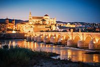 Blaue Stunde über dem andalusischen Córdoba: Ein Blick über den Río Guadalquivir und die Römische Brücke Puente Romano auf das Wahrzeichen der Stadt, die berühmte Mezquita-Catedral de Córdoba.