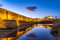 Romeinse brug over de rivier Rio Guadalquivir en de Mezquita - Catedral de Cordoba bij zonsondergang, Cordoba, Andalusië, Spanje