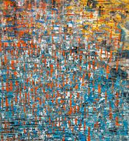 Mixed media schilderij, waarbij dikke olieverf op een kleurrijke acryl onderlaag is aangebracht.