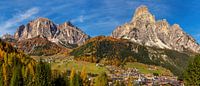 Corvara is een bekende toeristische plaats in het bergmassief van de Italiaanse Dolomieten, in de gemeente Badia. Hier zien we een herfstpanorama met de berg Monte Sassongher aan de rechterkant.