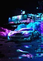 Een sportieve, gestileerde zwarte Corvette C7 met oplichtende blauwe en paarse neonaccenten wordt omringd door rook in een donkere stedelijke omgeving, verlicht door helder verlichte reclameborden.