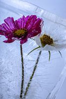 Cosmea-bloemen rood en wit in ijs van Marc Heiligenstein