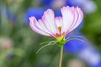 Close-up fotografie van een wit/roze Cosmea bloem, solo tussen de blauwe Korenbloemen. De foto heeft een mooie zachte achtergrond met een scherpe bloem op de voorgrond.