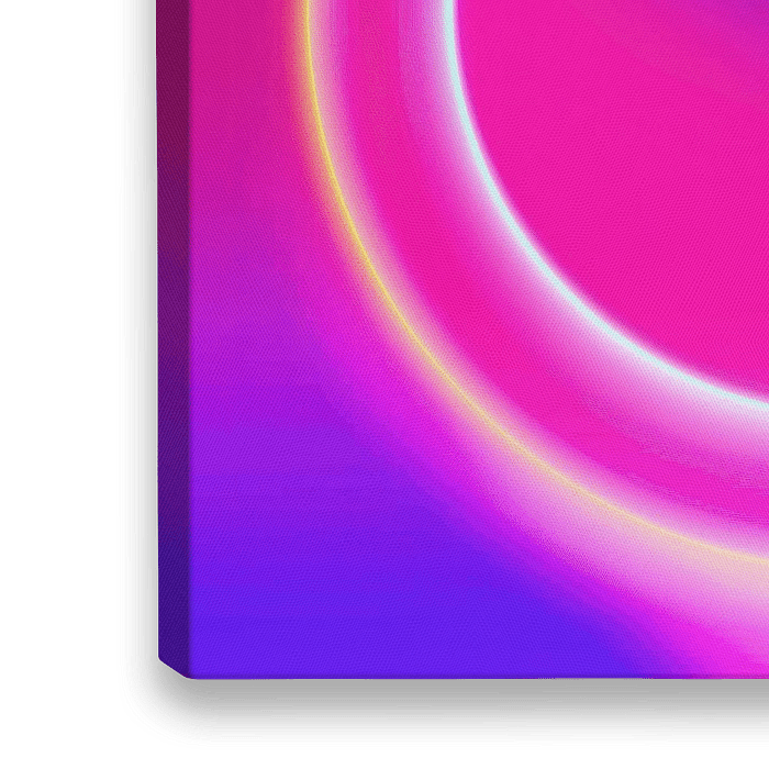 Een felgekleurde, bijna lichtgevende cirkel zweeft in een ruimte van neon roze en diepblauw. Het beeld voelt futuristisch, energiek en hypnotiserend - een visueel portaal vol beweging en licht.
