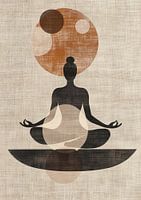 Cosmic Silence - Dit menselijk figuur schilderij illustreert een serene scène van meditatie. Centraal staat een figuur in een lotushouding, uitgevoerd in strakke, minimalistische silhouetten die bijna als schaduwen tegen de achtergrond werken. Deze figuur is opgebouwd uit donkere tinten tegen een lichtere, ruw getextureerde achtergrond…
