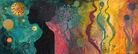 Details: vrouw, abstract, kosmos, kleurrijk, modern, silhouet, sterren, planeten, oranje, geel, blauw, rood, groen