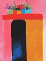 Deze levendige compositie straalt pure vreugde uit door zijn gedurfde kleurenpalet en gestileerde vormen. Boven een abstracte architecturale structuur staan kleurrijke bloemen in potten, die als een tuin op een altaar lijken te rusten. De harmonie tussen roze, rood, oranje, blauw en zwart creëert een dynamisch contrast dat tegelijk…