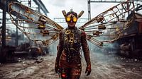 Steampunk cosplayer wandelt door een post-apocalyptische industriële omgeving, met sierlijke mechanische vleugels en een stijlvolle bril. Combineert fantasierijke elementen met futuristisch design.